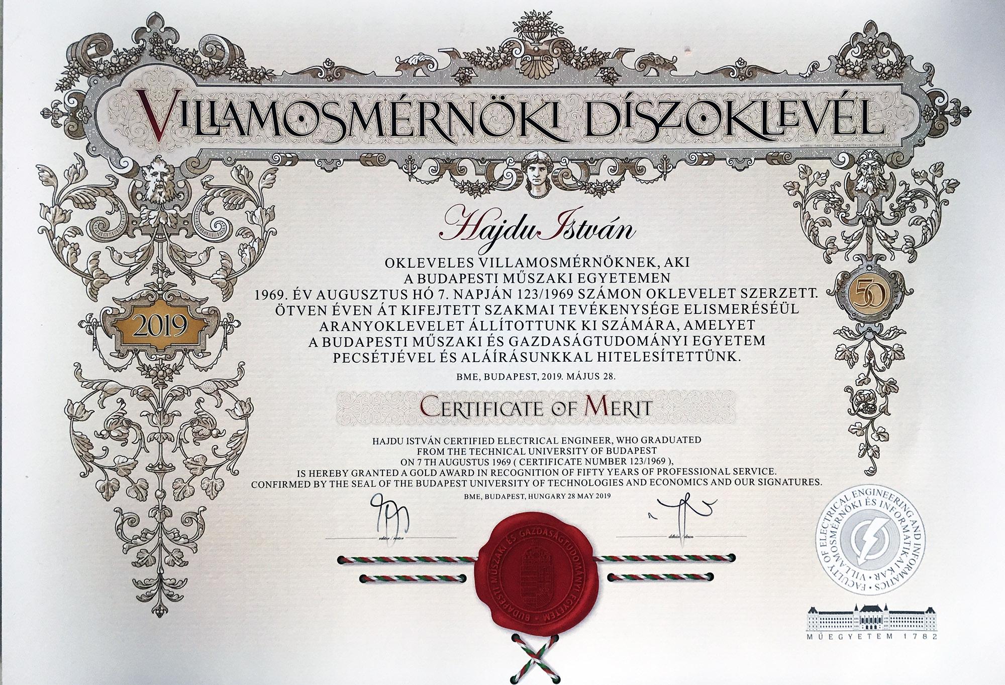 Hajdu István c. egyetemi docens 2019. 05. 28-án aranyoklevélben részesült. Ötven éves kiemelkedő szakmai tevékenységéhez szívből gratulál a tanszéki közösség!